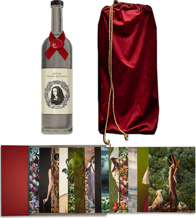 - A bottle of the finest Tobala mezcal, presented in a velvet pouch embroidered with the Odisea de Juana emblem above. 750 ml.