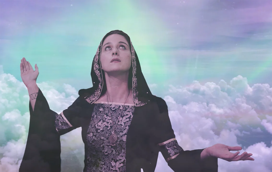 en el cielo imaginado por Juana, donde Juana con su atuendo medieval disfruta de su arco y flecha, quien